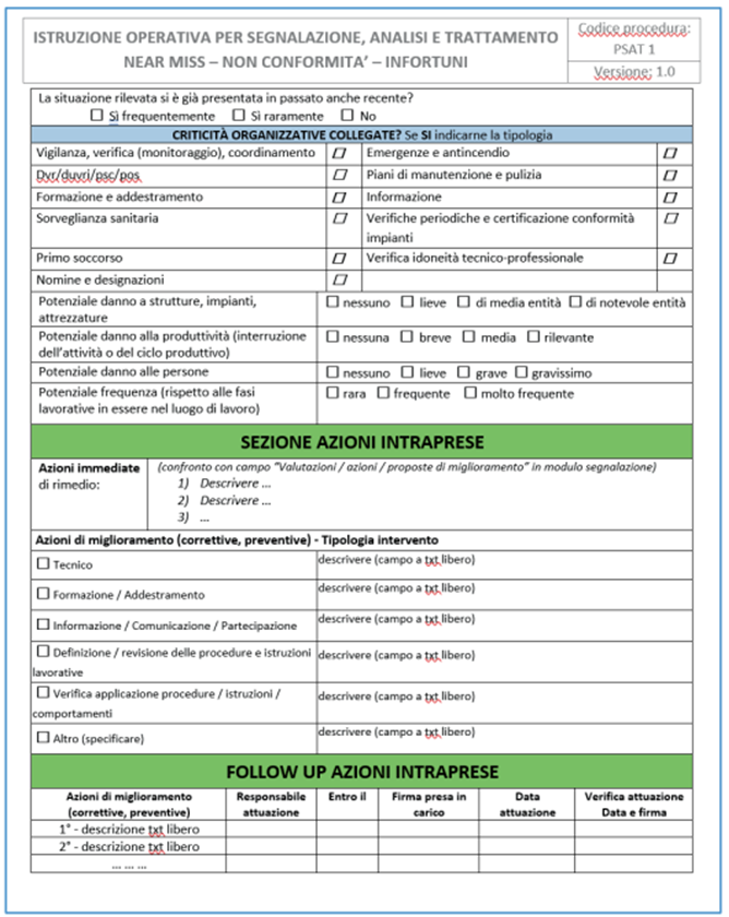 | Segnalazione Near miss o Non conformità | Lavoratore /Preposto/ RLS | MOD 1 |